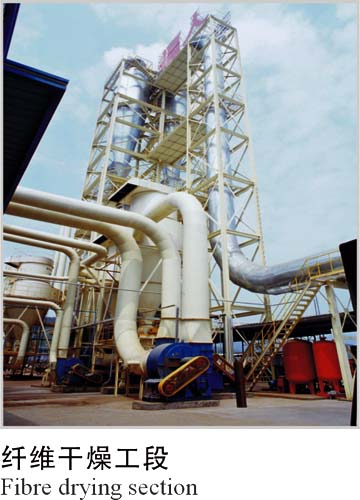 施过胶的纤维随热磨机的蒸汽由喷放管喷入干燥管,然后由高温的热风以正压气力输送方式将湿纤维沿干燥管道风送到旋风分离器,输送过程中在热风的作用下纤维中的水份随之蒸发,干燥后的纤维与含有水蒸汽的空气在旋风分离器中进行分离后,送入干纤维料仓储存。